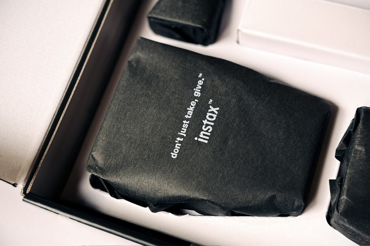 instax mini Evo Cinemaのパッケージ。中は洒落た紙製の袋で包まれてた。