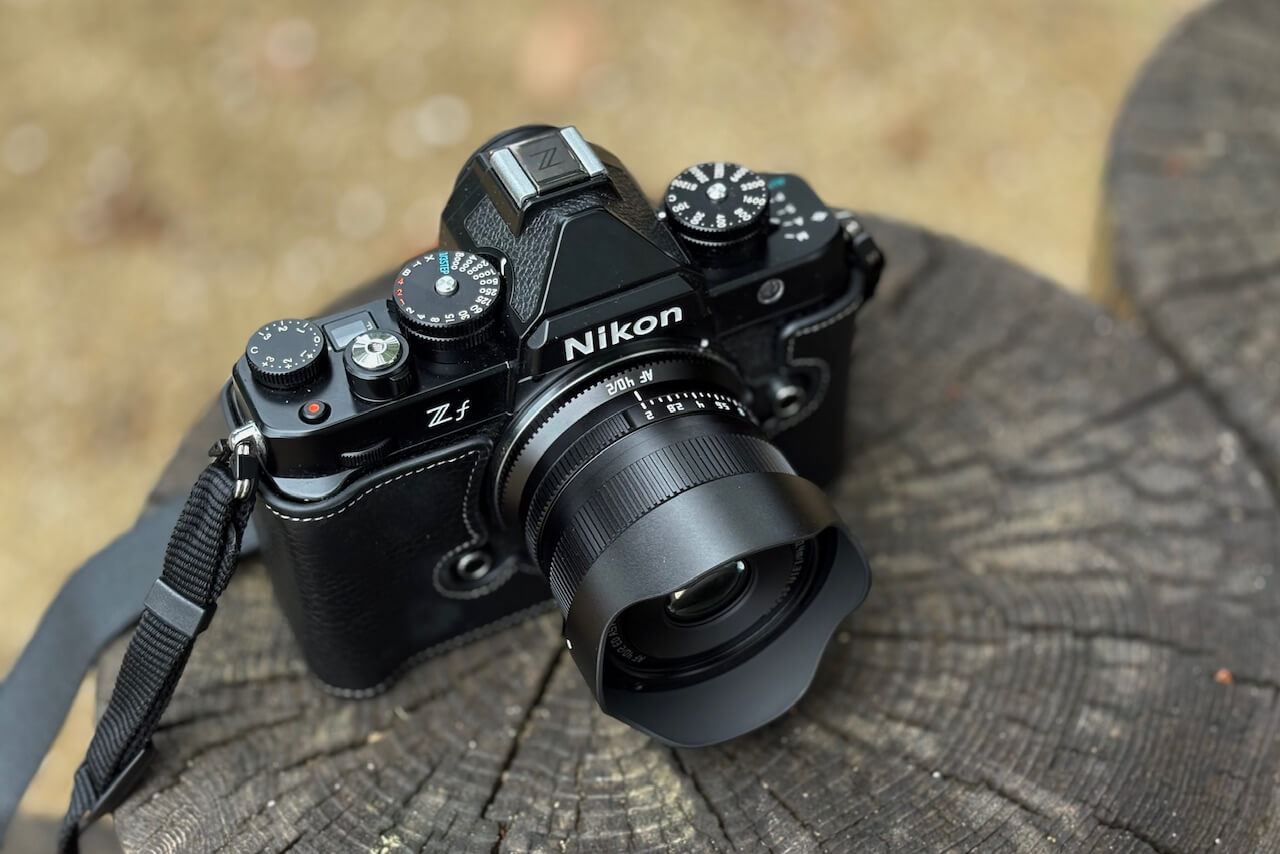 絞りリングが刻まれたレンズの質感も、なかなか凛々しくカッコいい。デザイン自体はクラシックではないが、シンプルで真っ暗な造形に形のいいフードが効いていて、Zfに装着するとクラシカルモダンといった趣になる。