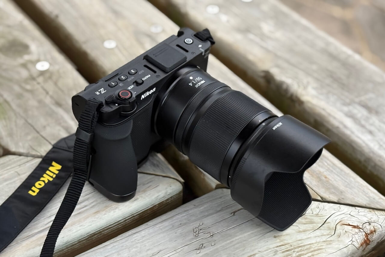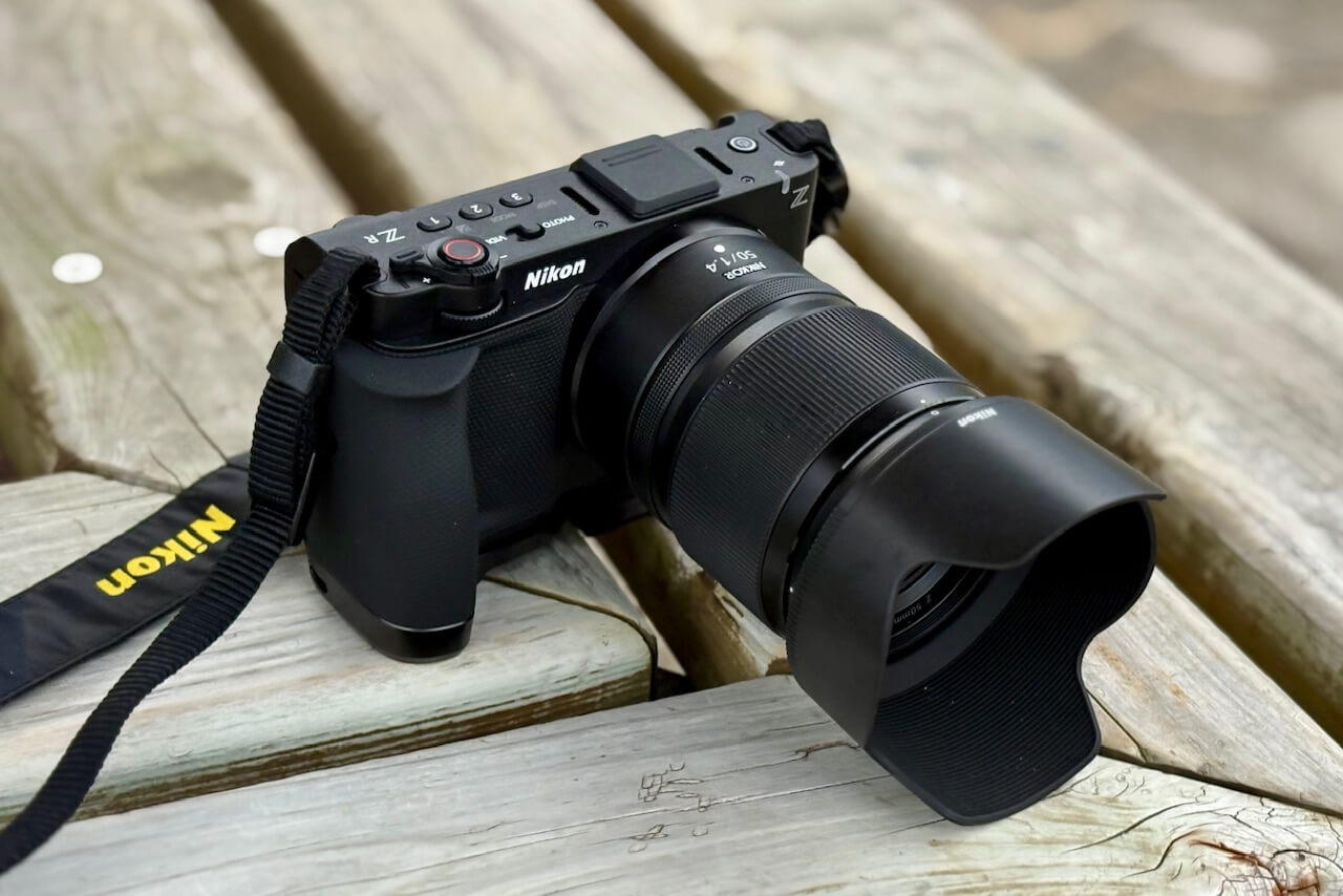Nikon ZR, Nikkor Z 50mm f1.4, SmallRig L型グリップ装着したフォルムは想像したより全然悪くない。グリップの滑り止めのパターンも本体グリップ部と同じ素材感で実に自然な見た目だ。僕が気にしていた「四角いニコン」というフォルムも崩れていないと思う。