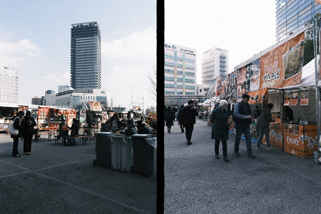 instax mini Evo Cinemaを手に持って歩いたり、人通りの多い場所で構えたりするとさすがにある程度目立つと思うけど、その点、X halfは首からぶら下げていても特に視線は感じない。コンパクトなだけじゃなくて、そのクラシックなフォルムも街中にいい感じで溶け込むからだろう。